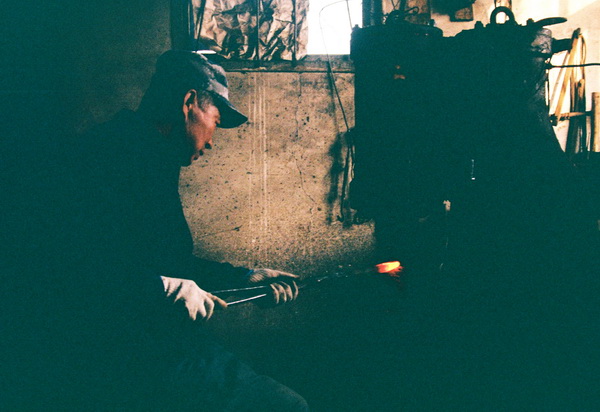 我找出爸爸当初编席破迷子用的刀,请锡财哥加工。他从80年代中期就开始打铁了,对小时的我来说,看打铁是莫大的乐趣。天近黄昏,南屋的铁匠铺有些暗,我勉强拍个侧影。过了几天,锡财哥把刀修好,换了刀柄,送到我家。(链接:2009年锡财打铁)