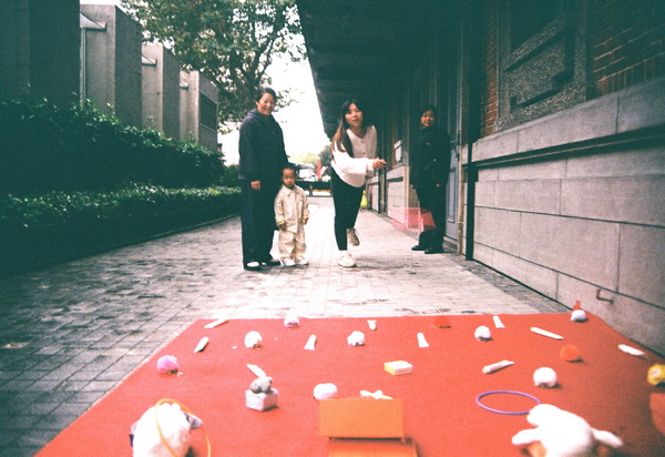 这是在上海历史博物馆的房檐下。地上的玩具倒也不见多么稀有,套圈之乐在于参与,大人屏息凝神,小朋友也看得全情投入。